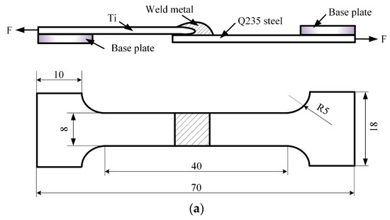 To investigate the mechanical properties of the welding joints, the tensile properties were evaluated by a testing machine with a speed of 0.5 mm∙min−1 at room temperature; specimens in Figure 3 were subjected to quasi-static tensile loading. To minimize bending stresses inherent in the testing, base plates were attached to both ends of the sample, as shown in Figure 3. For Joints I, II and III, three specimens were prepared for the testing experiment; the fracture morphology was observed by the SEM. The micro-hardness was measured by a HVT-1000A micro-hardness testing machine with the parameter HV 0.1/10 [26].