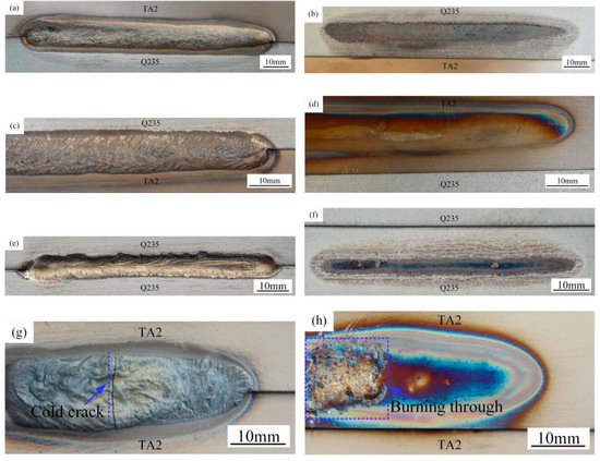 The lapped joint configurations, referred to in Figure 1, were fabricated from 100 mm × 50 mm sheets. As shown in Figure 1, configuration of top Ti-TA2 to bottom Q235 steel lapped joint (Joint I) (Figure 1a) and top Q235 steel to bottom Ti-TA2 lapped joint (Joint II) (Figure 1b) were adopted in the experiment with an overlap distance of 10 mm. The arrangement of the test sheets with respect to the weld torch was shown in Figure 1. The angle between the welding torch and the lap seam was 45° away from the direction of welding. The welding direction was parallel to the lap seam and was offset from the edge of the steel sheet edge by a deviation distance (D). All joints were welded using a Fronius arc welding system (CMT 3200) (Fronius, Austria). To obtain sound weld appearance and satisfied mechanical properties, various welding variables were used, as shown in Table 3. A 100% argon shielding gas with a flow rate of 15 L/min was used throughout the experiments. To compare the weld appearance and mechanical properties, steel-steel lapped joint (Joint III) and Ti-Ti joint (Joint IV) with Cu wire were also performed at the same welding parameters. The base metals of steel-steel lapped joint and Ti-Ti joint were hot dipped galvanized mild Q235 steel and TA2, respectively.