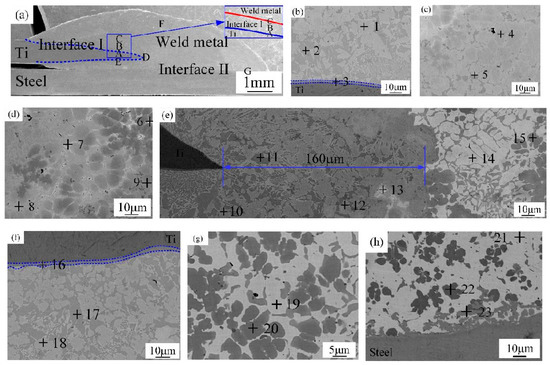 The microstructure of Ti-steel joint (Joint I) is shown in Figure 5. There were five regions in the Joint I classified into steel base metal, Ti base metal, Interface I (Ti base metal-Cu weld metal), Interface II (Cu weld metal-steel base metal) and Cu weld metal, as shown in Figure 5a. To reveal the features of the Interface I, zones A–E in Figure 5a were systematically magnified in Figure 5b–f, respectively. Combined with the relevant phase diagrams [27,28], EDS was applied to analyze the components of various zones, and the results are presented in Table 4. In Figure 5b, zone A in Figure 5a is composed of light gray block CuTi2 and AlTi3 (marked by point 1), dark grey block CuTi2 IMCs phase (marked by point 2), and a continuous layer (marked by point 3) (blue dotted line in Figure 5b) is a dual-phased IMCs composed of CuTi2 and α-Ti solid solution. In Figure 5c, zone B in Figure 5a is composed of amounts of AlCu2Ti (marked by point 4) and dark gray CuTi2 (marked by point 5). In Figure 5d, zone C in Figure 5a is composed of Cu solid solution (marked by point 6), Ti2Cu3 and βTiCu4 (marked by point 7), Ti2Cu3 and Ti3Cu4 (marked by point 8), and AlCu2Ti (marked by point 9). In Figure 5e, zone D in Figure 5a is also a mixed zone with all kinds of phases, which consists of CuTi2 and AlTi3 (marked by point 10), CuTi2 (marked by point 11), AlCu2Ti (marked by point 12), Ti2Cu3 and βTiCu4 (marked by point 13), (Cu) and Al3Ti (marked by point 14), and Al-Ti-Cu-Fe-Ni phase (marked by point 15). In Figure 5f, zone E in Figure 5a is composed of CuTi2 and α-Ti (marked by point 16), CuTi2 (marked by point 17), and CuTi2 and AlTi3 (marked by point 18). Weld metal (zone F in Figure 5a) is magnified in Figure 5g, which is composed of dark grey Al-Ti-Cu-Fe-Ni phase (marked by point 20), and (Cu) and Al3Ti (marked by point 21). The Interface II (zone G in Figure 5a) is magnified in Figure 5h, which is composed of (Cu) and Al3Ti (marked by point 21), Al-Ti-Cu-Fe-Ni phase (marked by point 22) and Fe-Ti-Cu IMCs (marked by point 23). Phase analyses are in good agreement results referred in [21,29].