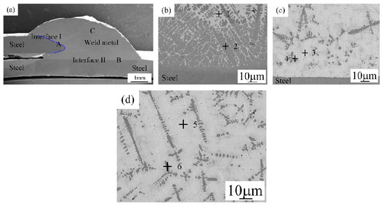 The microstructure of steel-steel joint (Joint III) is shown in Figure 7. Figure 7a presents the cross section of Joint III. From Figure 7a, the Joint III is composed of Interface I (zone A) between weld metal and top steel sheet, Interface II (zone B) between weld metal and bottom steel sheet, and weld metal (zone C). Table 6 presents the EDS analysis results of various zones in Figure 7a. Zones A and B in the Interface I and Interface II in Figure 7a were magnified in Figure 7b,c. The Interface I is magnified in Figure 7b, which is composed of (Cu) and Al3Ti (marked by point 1), and Fe-Al-Cu IMCs (marked by point 2). From Figure 7c, Interface II is composed of (Cu) and Al3Ti (marked by point 3), and Fe-Al-Cu IMCs (marked by point 4). The weld metal is composed of (Cu) and Al3Ti (marked by point 5), and Fe-Al-Cu IMCs (marked by point 6), as shown in Figure 7d.