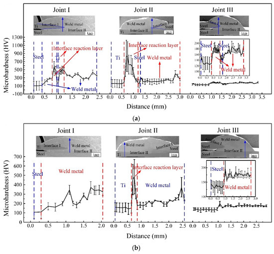 Figure 8 is the micro-hardness value variation of joints. Figure 8a shows the micro-hardness variation along blue arrow in the cross section of Joints I, II and III, respectively. Regarding the Joint I, along with IMCs formed at the Ti-Cu weld metal interface, the micro-hardness of 500 HV in the interface reaction layer is higher than that of weld metal and base metal. Al-Ti-Cu-Fe-Ni phase and Cu solid solution were formed in the weld metal, which led to the low micro-hardness of weld metal. With regard to the Joint II, including Al-Ti-Cu-Fe-Ni phase and Cu solid solution, hard and brittle TiFe2 IMCs phase formed at Interface I (Ti-steel); the micro-hardness 800 HV in the interface reaction layer is higher than that of weld metal and base metal. As for the Joint III, there was no reaction layer at Interface I. The micro-hardness variation from base metal to Interface II to weld metal of Joints I, II, and III is shown in Figure 8b, respectively. In comparison with Joints I and III, there is no distinct interface reaction layer. And for Joint II, the micro-hardness of interface reaction layer was higher than that of weld metal and base metal because of Cu-Ti-Fe IMCs, CuTi2 IMCs, and Ti solid solution formed at Interface II.