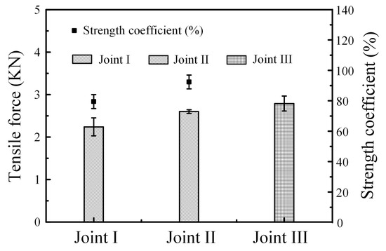 Figure 9 shows the tensile force of joints. In Figure 9, Joint I has low tensile force about 2.24 KN, but the tensile force of Joint II was greatly improved, and the value was 2.6 KN, which was close to tensile force of 2.79 KN for Joint III and reached 93% tensile force of steel-steel joint (Joint III) [30,31].