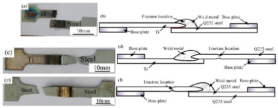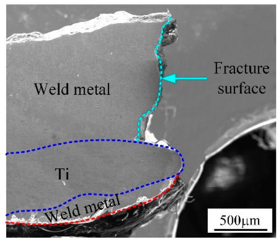 In order to reveal the strengthening mechanism of Ti-steel Joints, fracture behaviors of different specimens were investigated as shown in Figure 10. To be noted, the corresponded fracture location is illustrated by a red line in Figure 10b,d and f. The Joint I was initiated at the Interface I between the weld metal and Ti base metal and propagated to weld metal. The Joint II was fractured at the steel base metal. The Joint III was also fractured at the steel base metal. In addition, the fracture surfaces of joints were displayed in Figure 11. In Figure 11a, the fracture of Joint I was primarily dominated with river patterns; correspondingly, the inclusions at the site of crack source were composed of AlCu2Ti, as shown in Table 7. The fracture of Joints II and III with a distinct dimple pattern were shown in Figure 11b,c. In Figure 12, it is obvious that the crack of Joints I was initiated at the Interface I (blue dotted line in Figure 5a) between the weld metal and Ti base metal, then propagated to weld metal, and finally fractured.