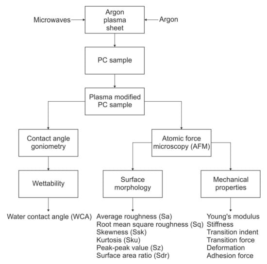 An overall diagram of the investigation methodology of the polycarbonate material modification by an atmospheric pressure microwave plasma is presented in Figure 1. A microwave-excited (2.45 GHz) plasma generated in argon at atmospheric pressure was used. Due to the energy transfer from the electromagnetic field of the microwaves into the plasma forming gas (argon), the plasma is generated and sustained inside the flat quartz box and, because of the gas flow, the plasma sheet protrudes outside of the box, permitting the processing of the PC samples’ surfaces. As a result of this, plasma-modified PC samples are obtained. The changes in the wettability of the plasma-modified PC samples’ surfaces were characterised by the water contact angle, measured with the use of standard contact angle goniometry, while the changes in the PC samples’ surface morphology and mechanical properties were investigated by atomic force microscopy (AFM). This diagnostic tool was successfully utilised in the evaluation of submicron changes of the surfaces’ properties after exposure to the plasma [,,,,,]. A detailed description of the PC sample surface modification by an argon microwave plasma, the contact angle goniometry, and atomic force microscopy is provided later in the text.