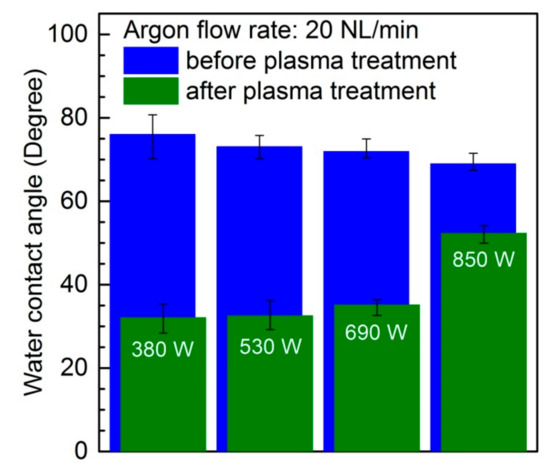 The effect of the microwave power on the water contact angle at an argon flow rate of 20 NL/min is shown in Figure 3. The results correspond to an absorbed microwave power of 380 W, 530 W, 690 W, and 850 W. For each absorbed microwave power, the water contact angle before plasma treatment is given. All of the presented results relate to a single scan (number of scans equal to 1) of the PC sample surface by an argon plasma sheet. To prevent the ageing effect, the water contact angle was measured directly after the plasma treatment. As expected, as it can be seen from the figure, for all of the tested values of absorbed microwave power, the water contact angle decreased after plasma treatment. Depending on the level of absorbed microwave power, the water contact angle dropped from 1.3 times to 2.4 times. The highest change in the water contact angle (2.4 times) was recorded for the lowest absorbed microwave power (380 W). In this case, the water contact angle changes from about 76° for a plasma-untreated PC sample to about 32° if the PC sample was treated with the argon plasma one time. The lowest change in the water contact angle (1.3 times) corresponds to the highest absorbed microwave power (850 W). In the case of absorbed microwave power of 850 W, the plasma treatment led to a decrease of the water contact angle from about 70° to about 52°. As it was mentioned above, the presented results on changes in the water contact angle relate to a single scan of PC sample with the argon plasma sheet. The results of our experimental study with microwave plasma treatment of different polymeric materials show that the effect of decreasing the water contact angle by the second scan is not as significant as after previous scan. In order to exclude the time-consuming multiple scanning, the more appropriate way to further improve the water contact angle is to increase the plasma treatment time. As it can be found in Reference [] in the case of DC air low pressure plasma treatment of PC samples, in Reference [] in the case of RF argon low pressure plasma treatment of PC samples, in Reference [] in the case of DC argon low pressure plasma treatment of PTFE samples, in Reference [] in the case of DBD air atmospheric pressure plasma treatment of PC samples, and in Reference [] in the case of AC argon atmospheric pressure plasma treatment of PET samples, the decrease in water contact angle is a plasma treatment time-dependent effect. Thus, it can be expected that by increasing the microwave plasma sheet treatment time, the water contact angle can be further improved.