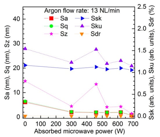 Figure 5 illustrates the effect of the microwave power on the roughness parameters of the PC sample. The results corresponded to an absorbed microwave power of 300–690 W and an argon flow rate of 13 NL/min. In the figure, such roughness parameters as average roughness (Sa), root mean square roughness (Sq), peak-peak value (Sz), skewness (Ssk), kurtosis (Sku), and surface area ratio (Sdr) are taken into account. For all of the above-listed parameters, their values for the plasma-unmodified PC sample are given (depicted by 0 W of absorbed microwave power). As can be seen, Figure 4 shows the different changes in the individual surface morphology parameters after plasma treatment with the absorbed microwave power. While the main roughness parameters (Sa, Sq, Sz) decrease with the energy increase, one can also observe the Ssk decrease, indicating the more significant role of the holes in the morphological properties, as well as the Sku decrease, providing the information about the smoothing the height distribution curve. The Sdr parameter also decreases while the energy of the process increases, revealing reduction of the active surface. Yet, the results acquired at 460 W indicate that one may obtain the opposite results, as the larger energies may rapidly disturb the control of the process and lead to an unwanted outcome. Therefore, the alternative approach instead of the high power of the unit application, was the multi-pass of the sample.