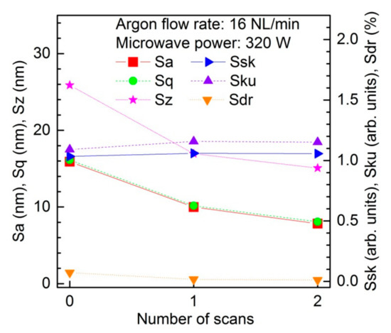 The dependence of the roughness parameters (Sa, Sq, Sz, Ssk, Sku, Sdr) of the PC sample on the number of plasma scans is shown in Figure 6. The measurements were carried out at an absorbed microwave power of 320 W and at an argon flow rate of 16 NL/min. Depending on the variable being tested, a different number of scans (0–2) with constant speed was performed. In the figure, the results corresponding to the number of scans equal to 0 indicate the results for the plasma-unmodified PC sample. The roughness parameters (Sa, Sq, Sz) decrease along with the following scans. In addition, the Sdr parameter reveals the reduction of the active surface. Additionally, the increase of the Ssk parameter reveals the less significant contribution of the holes in the morphology. Finally, the Sku parameter shows a narrower distribution of the height values, so one can conclude that the process allowed improvement of the surface in terms of morphology, by reduction of the roughness and the presence of holes in particular, while the wettability was improved. Therefore, one can clearly see that the plasma scans changed the surface energy and the effect is exposure-time-dependant. Having the data from both, energy and repetition experiments, one can conclude that in order to improve the surface’s quality by reducing the roughness, one has to consider several repetitions of the low energy procedure than a single pass with large energy. A thermal effect, energy correlated, causing the morphological degradation is very likely involved in such a phenomenon. It should be emphasized that the applying of further plasma processing sessions may cause a change in the morphological parameters change direction. Such non-monotonic appearance was observed in other investigations based on light-polymer interaction [,,,].