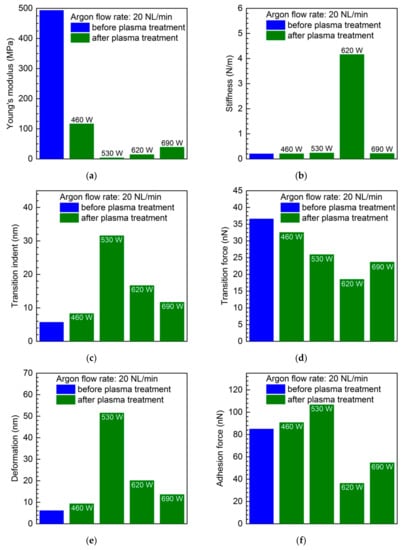 The dependencies of the polycarbonate surface’s mechanical properties parameters, including Young’s modulus, stiffness, transition indent, transition force, deformation and adhesion force, on the microwave power are shown in Figure 7. The argon flow rate entering the microwave plasma source was set at 20 NL/min, with the absorbed microwave power being varied between 460 W and 690 W. Figure 7a–f show the results for Young’s modulus, stiffness, transition indent, transition force, deformation, and adhesion force, respectively. Similar to the previous results presented in Figure 3, Figure 4, Figure 5 and Figure 6, and also in this case, the proper values for the sample not subjected to plasma modification are given. The results in Figure 7 clearly indicate changes of the above-mentioned parameters caused by the treating of the PC samples by the microwave argon plasma. They are mostly nonlinear and irregular and some of these changes are significant. From Figure 7a, a noticeable decrease of the Young’s modulus at any absorbed microwave level can be observed. In contrast, Figure 7b shows that at absorbed microwave power of 460 W, 530 W, and 690 W, no significant changes in the stiffness were registered. However, at the absorbed microwave power of 620 W, a significant increase of the stiffness can be seen. The results on Figure 7c show an irregular increase of the transition indent with the absorbed microwave power, while in the case of Figure 7d, generally speaking, a transition force decrease with each increase in the absorbed microwave power can be noted. Further non-monotonic changes of the mechanical properties of the plasma-treated PC surface, such as the deformation and the adhesion force, can be seen in Figure 7e,f, respectively. Although for each absorbed microwave power level the deformation parameter is higher than for the pristine sample, the adhesion force at the first stage grows and then decreases with an increase of absorbed microwave power. Based on the results presented in Figure 7 concerning the dependencies of the polycarbonate surface mechanical properties parameters on the microwave power, one can note that the obtained results confirm the complex and non-monotonic changes of the mechanical properties of the surface, which mostly cannot be interpreted simply. It can be related to the co-existing various mechanism induced by the plasma beam, appearing with various intensities at different plasma power values.
