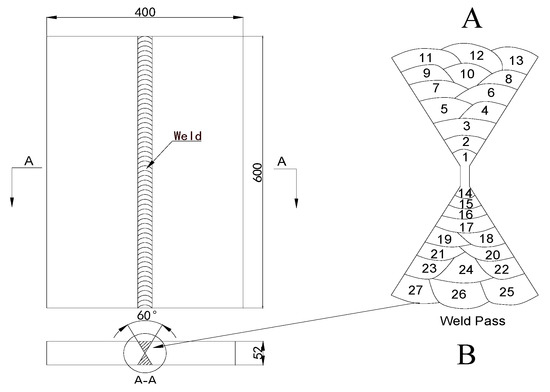 Manual shielded arc welding (SMAW) was carried out on SA738GR.B [22] steel plates. The chemical composition of the base metal is summarised in Table 1. Welding was carried out using a matching welding material (E9018-G-H4, composition as given in Table 1; electrode diameter, 4.0 mm). The geometry of two plates when welded into an X-groove, including the relevant dimensions, are presented in Figure 1. The length, width, and thickness are 600, 400, and 52 mm, respectively. The welding procedure is listed in Table 2. A minimum preheat temperature of 100 °C and maximum inter-pass temperature of 200 °C were used.