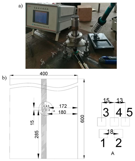 The residual stress was measured according to the indentation method [23]. As shown in Figure 3, five testing points (1 to 5) were distributed along the seam and heat-affected zone.