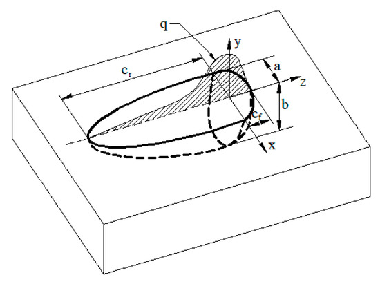 The double ellipsoidal heat source model, proposed by Goldak et al. (1984) [27], is shown in Figure 5. The rear portions and front of the heat source model are in two different ellipsoid quadrants. The power density distribution in the front portion is: