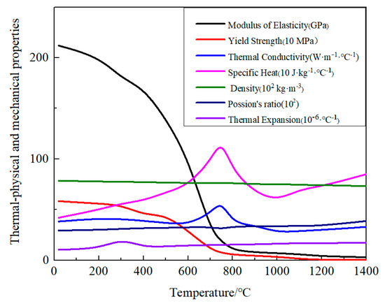 The temperature-dependent and thermo-physico-mechanical properties of SA738Gr.B were used in this work, as shown in Figure 6 [29]. The welding material shall have the same material properties as the base material of SA738Gr.B.