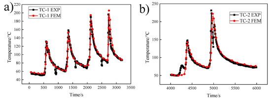It can be seen from Figure 8 that the simulation results of the thermal cycle curve of the temperature measurement point were consistent with the test results, and errors within the allowable range may be caused by the failure of the manual welding process to maintain a constant speed, the interference of the arc in the welding, the time difference caused by replacing the welding rod, and the influence of factors such as the temperature change upon arc initiation and arc withdrawal.