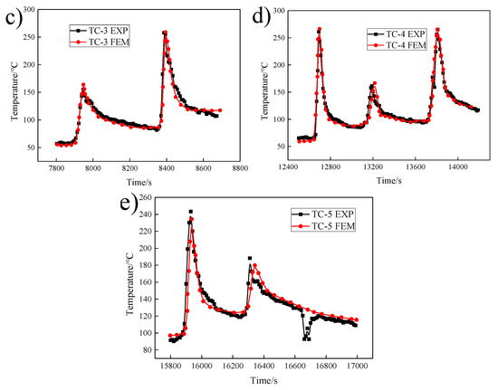 Comparison between the experimental value of temperature at TC-1 to 5 and numerical simulation: (a–e).