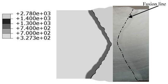 Comparison of fusion zone between EXP (experiment) and FEM (finite element modelling).