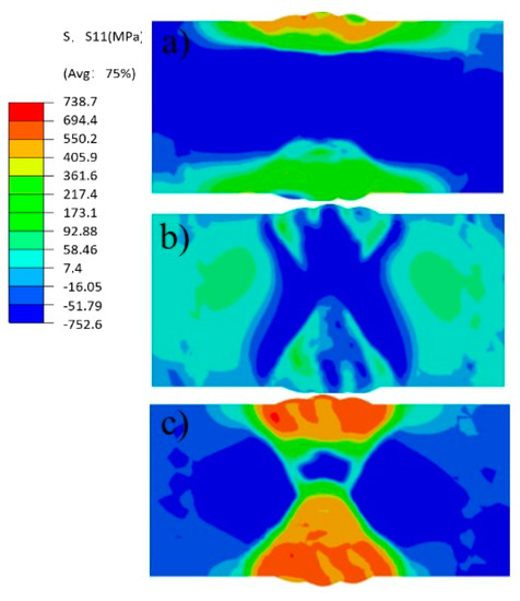 Stress contours (FEM) (a) S11; (b) S22; (c) S33.