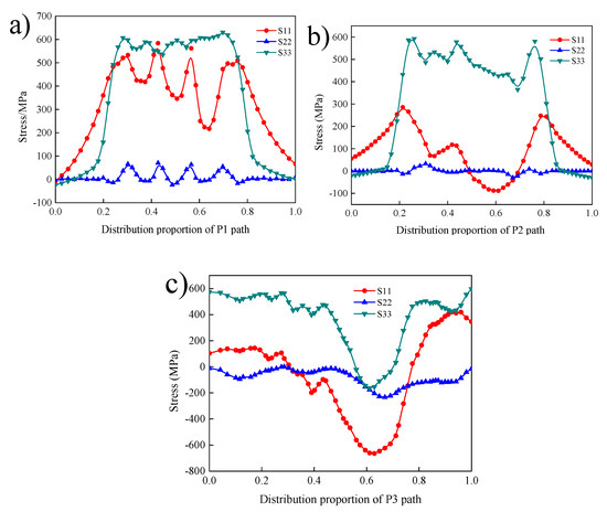 Three paths were taken from the welding material section, namely, P1 on the upper surface, P2 on the lower surface, and P3 on the middle line of the welding seam (Figure 7). The values of three output paths of transverse stress S11, normal stress S22, and longitudinal stress S33 followed.