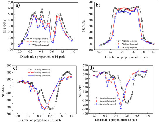 S11 and S33 stresses of different welding sequences along P1 and P3: (a) S11 along with P1, (b) S33 along P1, (c) S11 along P3, (d) S33 along P3.
