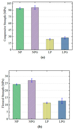 Mechanical properties of the PC specimens: (a) compressive strength; (b) flexural strength.