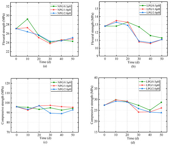 The results of the acid corrosion experiment: (a) flexural strength of normal-weight PC containing glass fiber (NPG); (b) flexural strength of lightweight PC containing glass fiber (LPG); (c) compressive strength of NPG; (d) compressive strength of LPG.