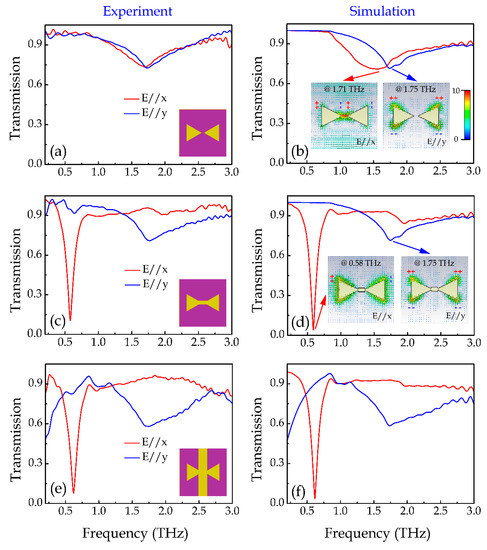 In order to gain in-depth understanding of the resonance modes of the DTD and DTDJ structures, finite-element time-domain (FDTD) method was carried out to simulate the transmission spectra. In the simulation, the metal was modeled as a material with a conductivity of 3.72 × 107 S/m, and the substrate was modeled as loss free silicon with relative permittivity of 11.9. Periodic boundary conditions were applied at both x and y directions. A plane wave (x-polarized or y-polarized) was set to normally illuminate onto the structure. The corresponding simulated transmission spectra of the DTD and DTDJ structures are respectively illustrated in Figure 2b,d, respectively. It can be seen clearly that the simulated results under both x- and y-polarized incidences are in good agreement with the experimental results in Figure 2a,c, which reveals the validity of the applied simulation method.