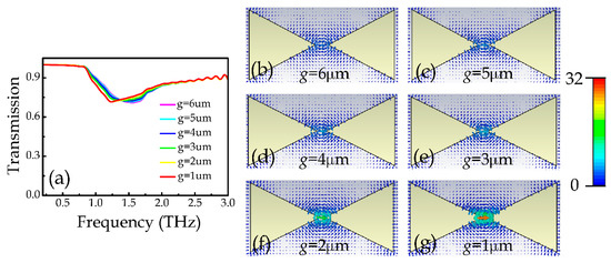 (a) Simulated transmission spectra of the DTD structures with different g from 6 to 1 μm under x-polarized incidences, respectively. (b–g) Simulated electric field distributions of the DTD structures with different g from 6 to 1 µm at the corresponding BDP resonance frequencies under x-polarized incidences, respectively.