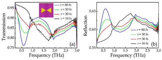 where σintra and σinter are respectively the conductivities contributed from the intraband electron-photon scattering and interband electron transition, e is the electron charge, kB is the Boltzmann constant, T is the temperature, ℏ is the reduced Planck’s constant, τ is the carrier scattering time, and EF is the Fermi level. In the terahertz range, the graphene conductivity is dominated by the intraband electron-photon scattering σintra. According to former published article [10,34,35], the strong terahertz incident field mainly affect the carrier scattering time τ because of the field-induced redistribution of the electrons. Larger field strength corresponds to smaller carrier scattering time. Here, we fixed the Fermi level of graphene EF = 0.8 eV, which could be achieved by applying external bias [36,37]; meanwhile, varied the carrier scattering time τ from 80 to 10 fs, which are in the level of previously reported works [34,35]. The corresponding required incident terahertz fluence in practice can be roughly estimated by the saturable power transmission function (see the Appendix A). Here, parameters of EF = 0.8 eV and τ = 80 fs correspond to an incident terahertz fluence level of ~170 μJ/cm2, and parameters of EF = 0.8 eV and τ = 10 fs correspond to an incident terahertz fluence level of ~5 μJ/cm2. Such terahertz fluence range is easily to achieve using strong-field terahertz system in reference 36, whose maximum terahertz fluence reaches 190 μJ/cm2. Here, we run numerical simulations to obtain the response of the DTDGS structure under strong-field terahertz incidences. In the simulation, we assume the thickness of the single layer graphene is 1 nm and its permittivity ε = εr + iεi is calculated by εr = −σi/(ωdε0) and εi = σr/(ωdε0) [33,38], where ω is the angular frequency, d is the thickness of graphene, ε0 is the vacuum dielectric constant. Figure 4 illustrates the calculated permittivity of the graphene at different carrier scattering time. It is seen that as the carrier scattering time decreases, the real part of the permittivity increases while the imaginary part decreases, indicating a gradually decreasing conductivity. Figure 5a,b illustrate the corresponding simulated transmission and reflection spectra, respectively, by substituting the calculated graphene permittivity into the DTDGS structure with gap distance of 1 μm, as shown by the inset in Figure 5a. It can be seen that the CTP resonance mode gradually vanishes as τ decreases due to the fact that smaller τ corresponds to smaller graphene conductivity, which makes the charges harder to transfer across the gap of the two triangles. Thus, the strength of the CTP resonance mode is gradually decreases and even disappears. To reduce the effect of misalignment in real fabrication, we design the width of the graphene to be 10 μm, which is much larger than the gap distance of 1 μm. Further simulation results show that, as long as the misalignment is smaller than 3 μm (the fabrication error of conventional lithography is normally around 1 μm), the design could still function well.