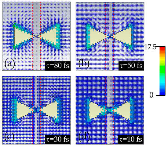 The above mentioned process was further confirmed by the simulated electric field distributions at the corresponding CTP resonances. As illustrated in Figure 6, when τ = 80 fs, corresponding to the lowest incident terahertz fluence, the electric field distribution is similar to that of the DTDJ structure, as illustrated by the left inset of Figure 2d, indicating the charges could pass through the gap due to the shoring effect by the large graphene conductivity. When τ decreases, corresponding to increasing the incident terahertz fluence, the electric field in the gap gradually increases, which means that the amount of charges that can pass through the gap reduces due to the decrease of the graphene conductivity, leading to a weaker CTP resonance.