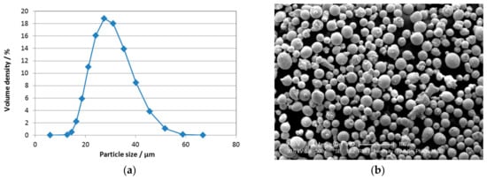 The quality of the metal powders has a marked effect on the quality of AM-processed final materials. The particle size distribution was analyzed with laser particle sizing using a Mastersizer 3000 equipment (Malvern Panalytical Ltd., Royston, UK), and the result is shown in Figure 1a. This is in line with the particle size distribution between 15 and 45 µm reported by the powder supplier. The shape of the powder particles was determined by scanning electron microscopy (SEM, Philips XL30, Philips Electron Optics, Hillsboro, OR, USA) to be predominantly spherical (Figure 1b).