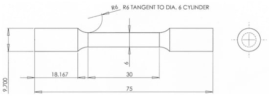 Mechanical properties of the samples were determined with an Instron 50.2 kN tensile tester. Three specimens were tested for each material condition. The geometry of the tensile test specimens used is presented in Figure 2. The specimens were machined out of vertically-built cylindrical samples, i.e., the tensile testing direction was along the build direction.