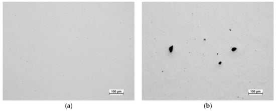 Preliminary tests for establishing suitable SLM processing parameters for 2205 duplex stainless steel suggest that a sufficiently high laser power, 250 W, should be used to minimize porosity. The process parameters used, with the 66° rotation in the scanning direction between the successive layers, resulted in a density of 99.97%, determined through image analysis of polished cross-sections from optical microscopy (Figure 3a), and of 99.99% according to X-ray CT analysis. The density value obtained with CT was higher, probably due to the limited resolution of the method, not detecting porosity smaller than ~30 µm with the used measurement parameters [33]. The density of the non-rotated scanning strategy sample was lower, at 99.01%, and there were notably larger pores present (Figure 3b). It is evident that to minimize porosity, it is beneficial to use a scanning strategy with rotation in the scanning direction between the layers. However, according to a recent comprehensive study on AISI 316L stainless steel, laser power plays a more dominant role in porosity formation during SLM processing than the laser scanning pattern [11].