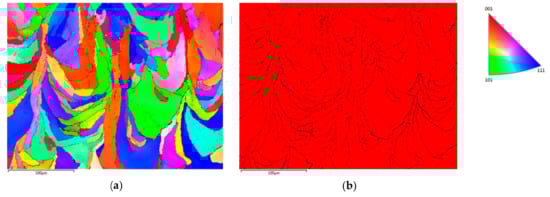 In SLM, the scanning strategy applied influences the resulting microstructure. In the present study, two samples were produced for investigating the effect of scanning rotation, both processed with otherwise similar parameters, but the first with a 66° rotation in scanning direction between the successive layers and the other one with no rotation between scan layers. According to the EBSD results, there were no clearly dominant preferred crystallographic orientations in the as-built microstructure processed with a 66° rotated scanning strategy (Figure 4a). Inverse pole figures of the BCC ferrite phase in the two as-built samples with different scanning strategies are presented in Figure 8. The maximum intensity of the preferred crystallographic orientations is higher and there is stronger <001> alignment in the building direction in the sample processed without scanning direction rotation (Figure 8a), in comparison to the sample with the 66° scanning direction rotation between the layers (Figure 8b). Therefore, to decrease the texture and anisotropy in mechanical properties, it seems beneficial to use the rotated scanning strategy.
