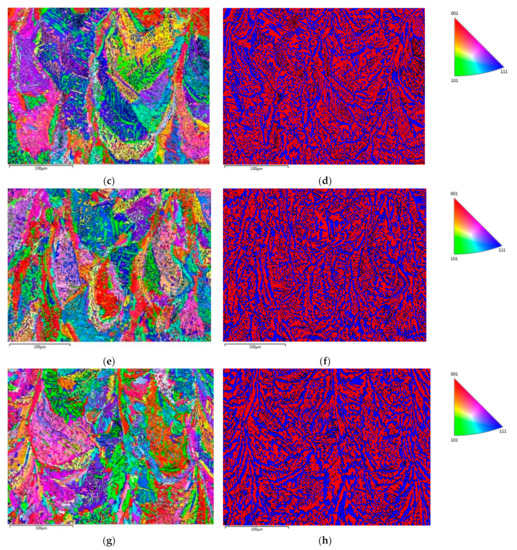 Microstructural features of the as-built and three heat-treated specimens, namely 1000 °C/5 min, 1050 °C/5 min, and 1000 °C/60 min, are illustrated in Figure 4 through EBSD inverse pole figures and phase maps. The as-built material (Figure 4a,b) exhibits a columnar grain morphology oriented along the build direction (vertical axis). Such an as-solidified grain morphology with columnar grains spreading over several successive layers along the building direction, as a result of epitaxial growth, is often observed in AM-processed metals [34]. The volume fraction of ferrite is approximately 99%. Minor austenite nucleation has occurred at the ferrite grain boundaries. Such a nearly fully ferritic solidification microstructure of as-built selectively laser-melted duplex stainless steels, due to high cooling rate, is consistent with the earlier results [6,7]. When the as-built stainless steel was heat treated, significant fractions of austenite phase were observed, nucleating at both melt pool boundaries and inside the ferrite grains. Figure 4c,d shows the microstructure after annealing at 1000 °C/5 min, Figure 4e,f after annealing at 1050 °C/5 min, and Figure 4g,h after annealing at 1000 °C/60 min, respectively. The driving force for the recrystallization and austenite nucleation during post-processing heat treatments is the high dislocation density of as-built stainless steel [7].
