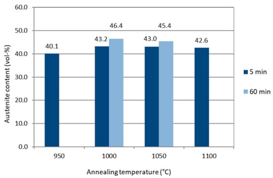 Volume fractions of the austenite phase, estimated from the EBSD data, are presented in Figure 5. With a 5 min annealing time, the austenite content is above 40% regardless of the annealing temperature (between 950–1100 °C) and reaches a maximum level of 43.0–43.2 vol.% at 1000 °C and 1050 °C annealing temperatures. For a longer 60 min annealing time, the austenite volume fraction is increased further, up to 46.4%. Several studies have shown that annealing at 1000–1050 °C results in the highest austenite content in duplex stainless steels [7,15,35,36]. Annealing reactivates the transformation of the metastable ferrite into austenite, which was suppressed by fast cooling. With increasing the annealing temperature, more metastable ferrite transforms into austenite, but simultaneously thermodynamic equilibrium favors the transformation of austenite into ferrite [35]. A balance is reached in annealing at temperatures between 1000 °C and 1050 °C.
