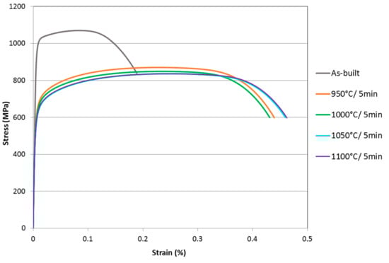 Engineering stress-strain curves measured for the different specimens are presented in Figure 6. The as-built condition, being almost fully ferritic and presumably having very high dislocation density like determined in [7], shows the highest yield strength and ultimate tensile strength in comparison to the heat-treated conditions.