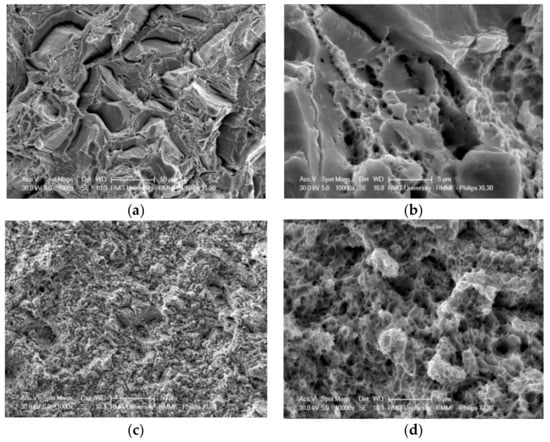 Images of fracture surfaces of tensile test specimens, as observed by SEM, are presented in Figure 7. In the as-built condition (a,b), when the microstructure is 99% ferritic, the fracture surface contains both brittle intergranular and ductile dimpled features. In the post-processing heat-treated conditions, when the microstructure consists of ferrite and austenite, the fracture surfaces consist of very small dimples (c,d), indicating a fully ductile fracture. The two phases have different deformation modes, and austenite improves the ductility and toughness of the material. The fracture surface features are quite similar in all the heat-treated specimens, demonstrating a fully ductile fracture, regardless of the annealing temperature or the holding time. This observation is in accordance with the tensile test data (Table 4 and Figure 6) and the EBSD results (Figure 4d,f,h), which show relatively similar mechanical behavior and microstructural features, such as the volume fractions and spatial distribution of the two phases, between the variously heat-treated specimens.