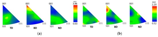 Pole figures of the body-centered cubic (BCC) ferrite phase in the as-built samples with different scanning strategies: (a) No scanning direction rotation between layers and (b) scanning direction rotated 66° between layers. TD = transverse to building direction, BD = building direction, and ND = normal to building direction.