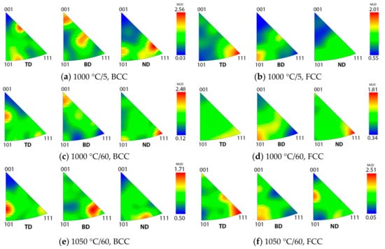 Pole figures of BCC (ferrite) and face-centered cubic (FCC; austenite) phases of heat-treated specimens: (a,b) 1000 °C/5 min, (c,d) 1000 °C/60 min, and (e,f) 1050 °C/60 min.