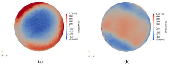 According to the residual stress measurements, in the as-built material, the residual stress state on the side surfaces of the cylindrical samples is tensile, whereas most areas inside the specimen are under compression (Figure 10a). Because of constrained horizontal contraction, the deposition introduces vertical tensile residual stresses along the side surfaces and compressive residual stresses in the inner part [23,42]. The maximum level of the tensile residual stress is 800 MPa, which is similar to the measured strength values of the as-built material (Table 4). After heat treatment (1000 °C/5 min), the residual stress distribution is considerably different (Figure 10b): The outer surface layers show compressive residual stresses, balanced by tensile stresses in the inner parts of the specimen. The magnitude of the residual stresses is lower in the heat-treated state, and the compressive stress state in the outer surfaces is beneficial.