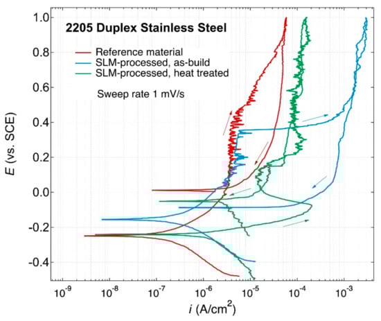 The as-built SLM-processed material was almost fully (99%) ferritic, whereas after the heat treatments the austenite content increased to 40–46%. In general, duplex stainless steels exhibit greater corrosion resistance than single-phase austenitic and ferritic stainless steels in chloride-rich media [43]. This is predominantly due to the high alloy content of Cr and Mo. Recent research has indicated that the galvanic interaction between the two phases favors the enhancement of the passive film by modifications of its chemical composition and semi-conductive properties [44].