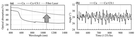 Figure 2a shows the optical (laser) absorption of both powders (pure Cu and Cu + C0.1) at different wavelengths, which ranged from 400 nm to 1400 nm. The addition of carbon nanoparticles to the virgin copper powder increased the optical absorption significantly over the full range of measured wavelengths. At the fiber laser wavelength (within 1060–1080 nm), the optical absorption is increased from 29% for pure copper to 67% for 0.1 wt % carbon-mixed-copper powder. Figure 2b presents the continuously measured angles over a period of time during the dynamic angle of the repose test. The carbon-mixed-copper powder shows a smaller variation in the maximum and minimum angles when compared to the virgin copper powder, which indicated an improved powder flowability. The small angle of repose value or smaller variation between the maximum and minimum angle demonstrates that the powder easily rolls inside the drum during rotation. As both of the powders show a dynamic angle of repose below 40°, they exhibit an excellent flowability and they are considered to be suitable for SLM.