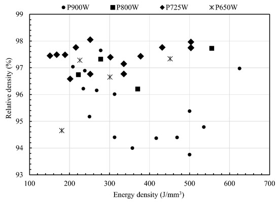 The relative density of SLM parts versus the applied laser volumetric energy density showing higher relative part densities could be obtained for a wide range of energy densities when a laser power of 725 W is employed.