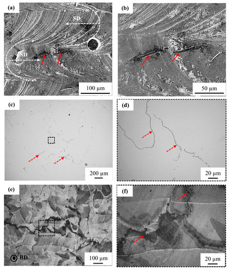 (a,b) SEM images of the top surface of the dense part processed with the optimized SLM settings. Melt pool boundaries and laser scan (SD) direction are indicated using white dashed curved lines and arrows, respectively. Surface cracks observed on the part top surface are indicated using red arrows, (c,d) LOM images of the XY plane after polishing. The surface cracks observed on the top surface are filled with a segregated material, as indicated by red dashed arrows. The defects seem to be located all over the surface forming a closed-loop in some areas, (e,f) LOM image of the polished sample in etched condition. The defects are observed along the grain boundaries growing over multiple melt pools.