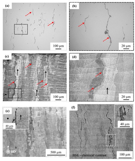 Figure 5 shows the vertical cross-section of a 98% dense part that was processed using the optimized laser scan settings. Figure 5a,b shows the defects oriented parallel to the building direction (BD), as indicated by dashed red arrows. The grains with epitaxial growth are orientated parallel to the BD and the segregated material defects are located along the grain boundaries of these grains, as seen in Figure 5c,d. It should be noticed that these ‘cracks’ (as observed on the unpolished top surface) are actually filled with segregated material. Figure 5e,f shows that these defects can be as long as 2 mm, and they are oriented along the BD. At higher magnification, as shown in Figure 5e, it can even be seen that the segregation lines are aligned with the sub-grain structures, exhibiting a cellular solidification morphology of the epitaxial grains. Moreover, these defects are observed at the boundary between different sub-grain (cell) orientations. To be clearer (inset of Figure 5e), the black arrows indicate the orientation of solidification cells within one grain, while the black dot illustrates that other solidification cells, located in a neighboring grain, are pointing out of the plane. The backscattered electron (BSE) image in Figure 5f shows the chemical difference between the copper matrix and the region that was enriched with segregated material. The defects are darker in color as compared to the copper matrix, which indicates that lighter elements segregate to the intergranular regions.