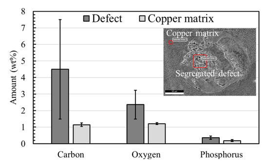 EDS analysis was performed in the segregated defect area and its composition was compared to the copper matrix. Figure 6 demonstrates that the segregated area contains a larger amount of impurity elements, such as carbon, phosphorus, and oxygen, when compared to the copper matrix and the copper is present in the balance amount. All of the defect features are dominated by carbon, followed by oxygen and phosphorus, as they have piled up in the segregated regions.