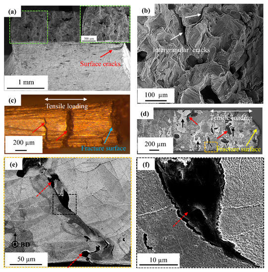 (a,b) SEM images of a fractured surface showing brittle fracture along with intergranular cracking. A surface crack is also indicated by the red arrow, (c) Binocular image of the side surface of the tensile tested sample with surface cracks parallel to BD, (d–f) show LOM and SEM images of the cross-section of the fractured sample in etched condition. These images show that the defects are oriented parallel to BD and are situated at the grain boundaries of the grains with epitaxial growth. The sample was tensile loaded in a perpendicular direction to the defects. The defect-rich region contains light elements, such as carbon, oxygen, and phosphorus.