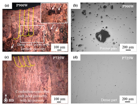 (a,b) Optical images of the part processed using a laser power of 900 W in etched and un-etched condition, respectively. The part shows extremely deep melt pools (~730 µm, indicated using yellow dashed curves) along with keyhole porosity lowering the part density. (c,d) show the microstructures of a part processed using a laser power of 725 W, indicating conduction-controlled semi-elliptical melt pools without obvious porosities. Both parts were processed at the same laser scan speed of 400 mm/s and hatch spacing of 0.12 mm.