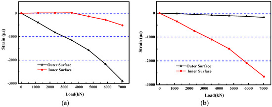 - In the shaft lining model test under a non-uniform load, the stress and strain of the outer surface in the direction of a large load and the inner surface in the direction of a small load were evidently larger than those in other directions or surfaces. Further, the tensile characteristics appeared in the inner surface of the large load at the initial stage of loading, which posed a hidden danger to the failure of the shaft lining model in the later stage.