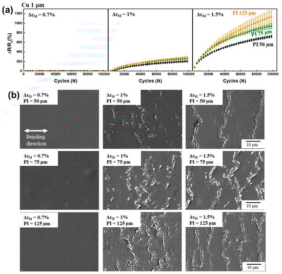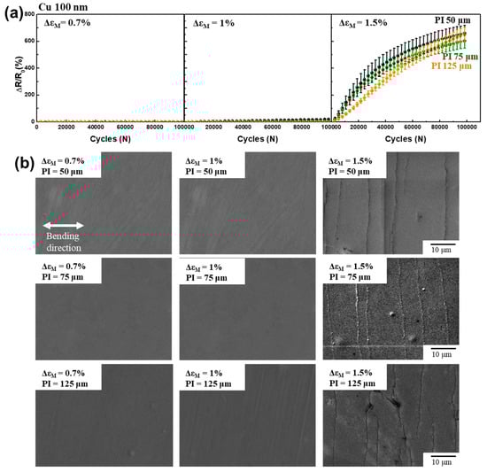(a) Normalized electrical resistance changes of 100 nm thick Cu film on 50, 75, and 125 µm thick polyimide (PI) as a function of the number of bending cycles under bending strain amplitudes of 0.7%, 1%, and 1.5%. (b) SEM images of 100 nm thick Cu film after the bending fatigue test.