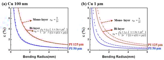To determine the exact bending strain of the metal film, we calculated the bending strains by using monolayer (Equation (1)) and bilayer (Equation (2)) models. Figure 4a shows the bending strains of 100 nm thick Cu films on the 50 and 125 μm thick PI. As the bending radius decreased, the bending strain of the metal film increased, and the metal film on the thinner polymer substrate showed less bending strain at a fixed bending radius because of a smaller mismatch from the neutral axis of the bending shape. Interestingly, for the 100 nm thick Cu film, the bending strains calculated from the monolayer and bilayer models were almost identical (Figure 4a), which implies that a thin metal film, such as the one that was a few hundred nanometers thick, does not cause the change of neutral axis and bending strain. In contrast, for the 1 μm thick Cu film (Figure 4b), the bending strains definitely differed with the strain calculation model: the bending strain obtained from the bilayer model was lower than that from the monolayer model. This implies that a thick metal layer, such as the one that was microns thick, may alter the stress distribution during bending deformation; the difference is quite large and cannot be negligible. Therefore, the bending strain should be carefully considered for thick metal films.